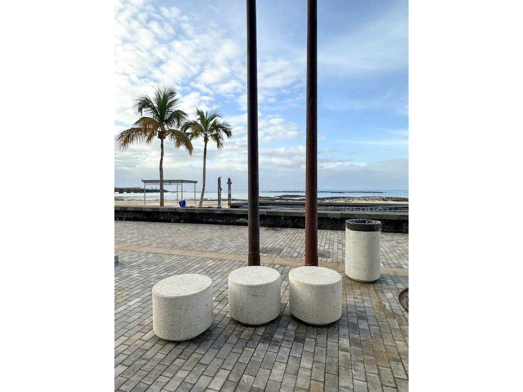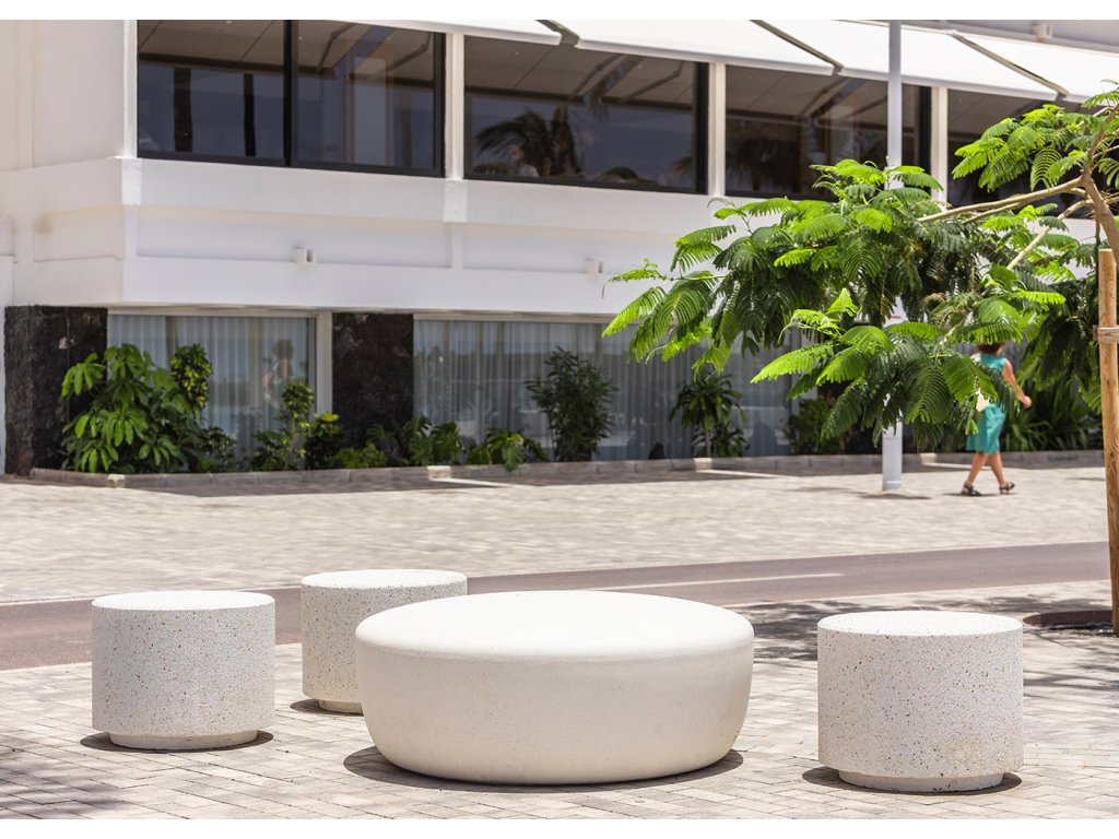 Betonový sedák z žulově šedého betonového prefabrikátu hrubého vzhledu může být umístěn v izolovaných prvcích nebo ve skupinách a tvořit tak betonové lavice různých tvarů.