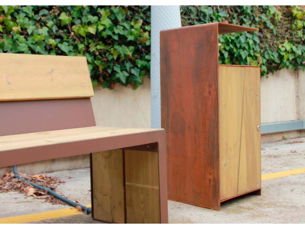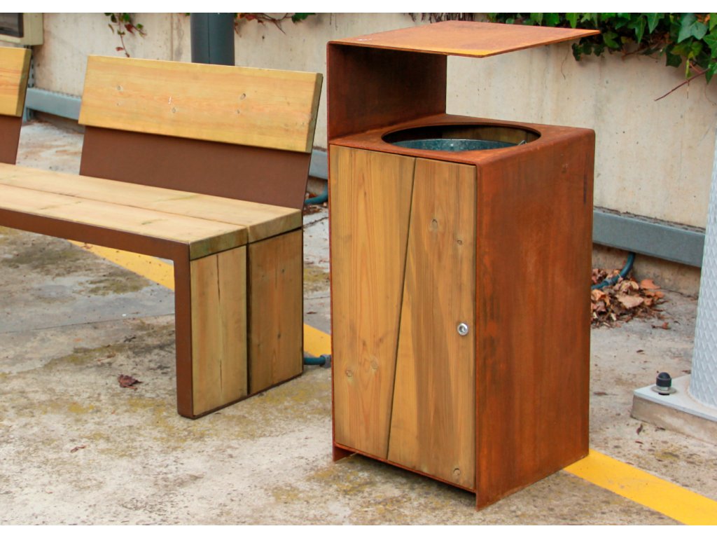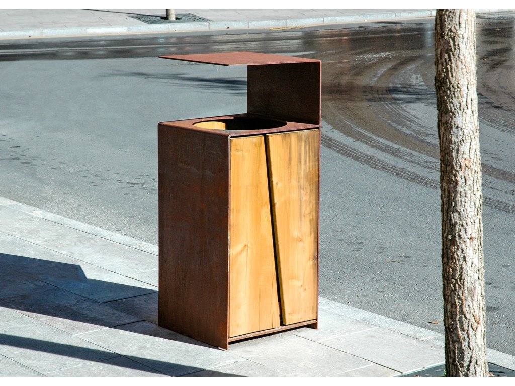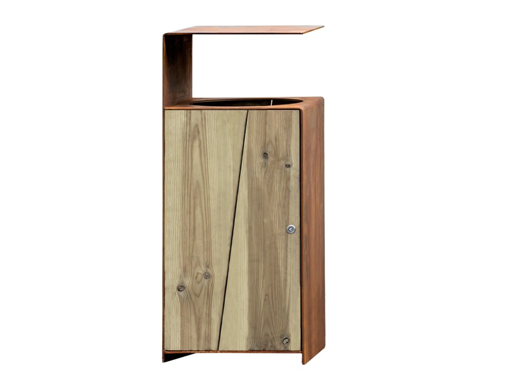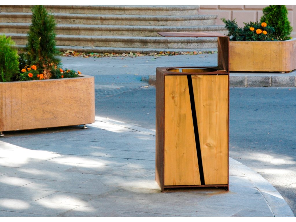 Odpadkový koš z desek z borovicového dřeva ošetřeného ve vakuovém tlakovém autoklávu třídy IV proti dřevomorce, termitům a hmyzu. Konstrukce koše s epoxidovým nátěrem a polyesterovým práškovým nátěrem v barvě Corten je pozinkovaná a vnitřní koš je z pozinkované oceli. Šrouby jsou z nerezové oceli.