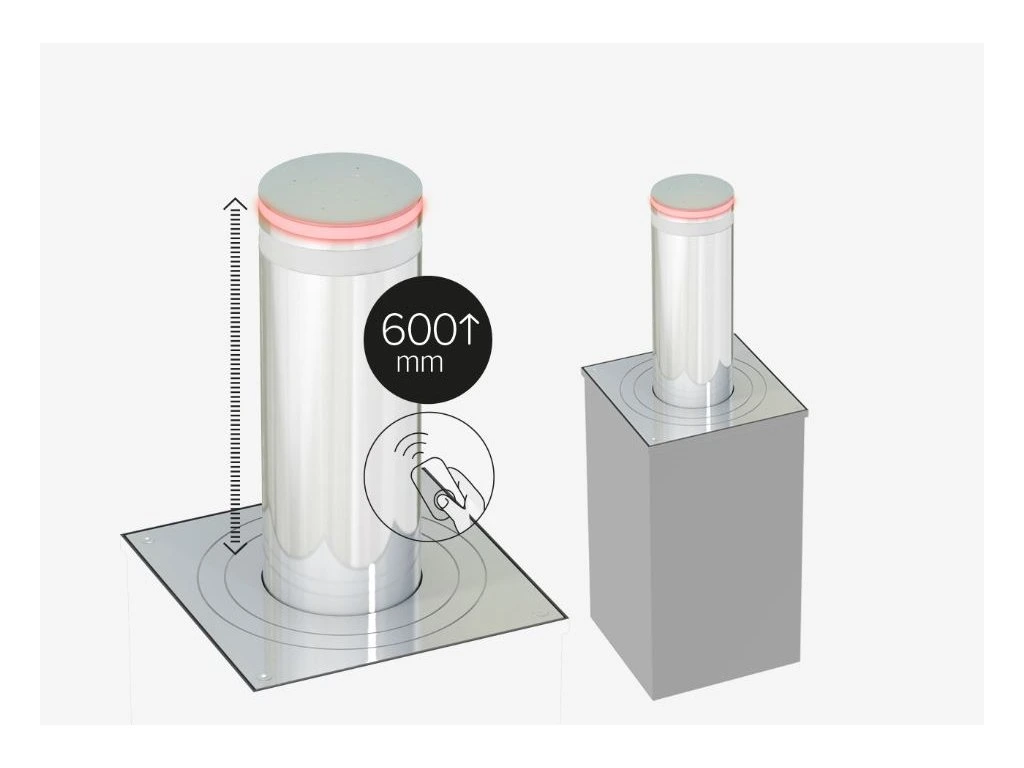 Výsuvný sloup je vyrobený s pístem z matné nerezové oceli AISI-304, Ø220 x výška 600 mm. Horní víko, základna, upevnění a šrouby z nerezové oceli.